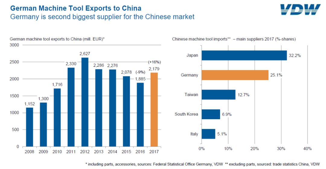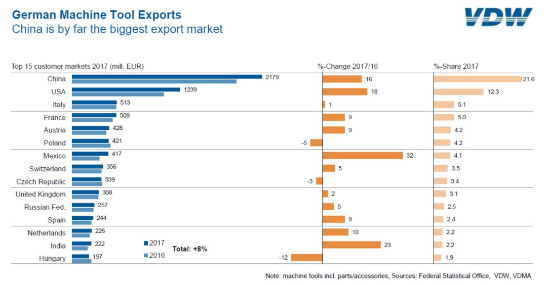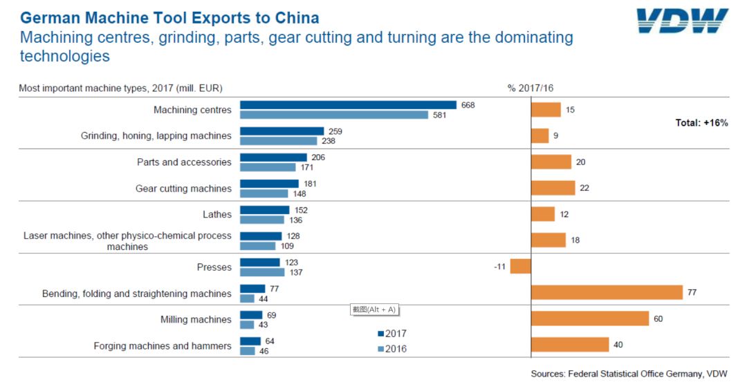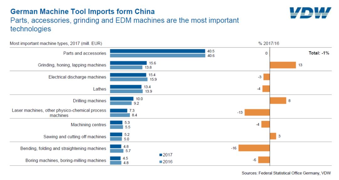 德中之間的業(yè)務(wù)并非有來(lái)無(wú)往。與過(guò)去5 年一樣,2017 年德國(guó)的采購(gòu)量占中國(guó)機(jī)床出口總額的4%-5%,成為位列第五的重要出口國(guó)。事實(shí)證明,部件與配件、磨削技術(shù)(磨床),還有車床和鉆床在德國(guó)市場(chǎng)很受歡迎。